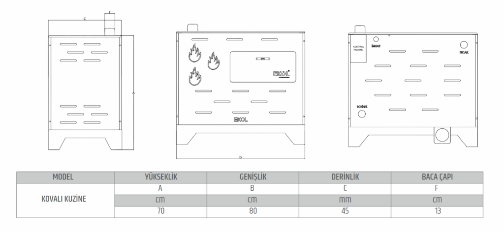 Katı Yakıtlı Kuzine Tipi Kalorifer Sobası, ısınma ve yemek pişirme ihtiyacını bir arada karşılayan çok amaçlı bir soba türüdür. Katı yakıt (odun, kömür vb.) ile çalışarak bulunduğu ortamı hızlı ve verimli şekilde ısıtır. Fan sistemi sayesinde her çeşit odun, kömür ve pelet vb. yakıtlar yakabilmektedir. Sobamız fanlı termostatlı ve kovalıdır.